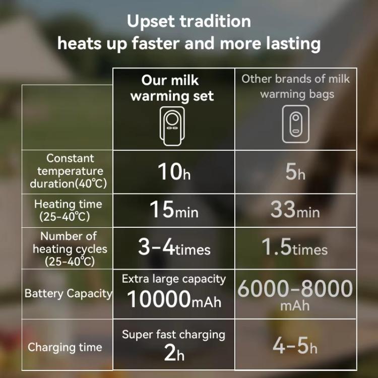 1. The baby bottle warmer sleeve built-in 10000mAh battery. It supports precise temperature control from 37 to 55 degrees Celsius. Compatible with bottle diameters of 50-80mm, it meets feeding needs both outdoors and at night.